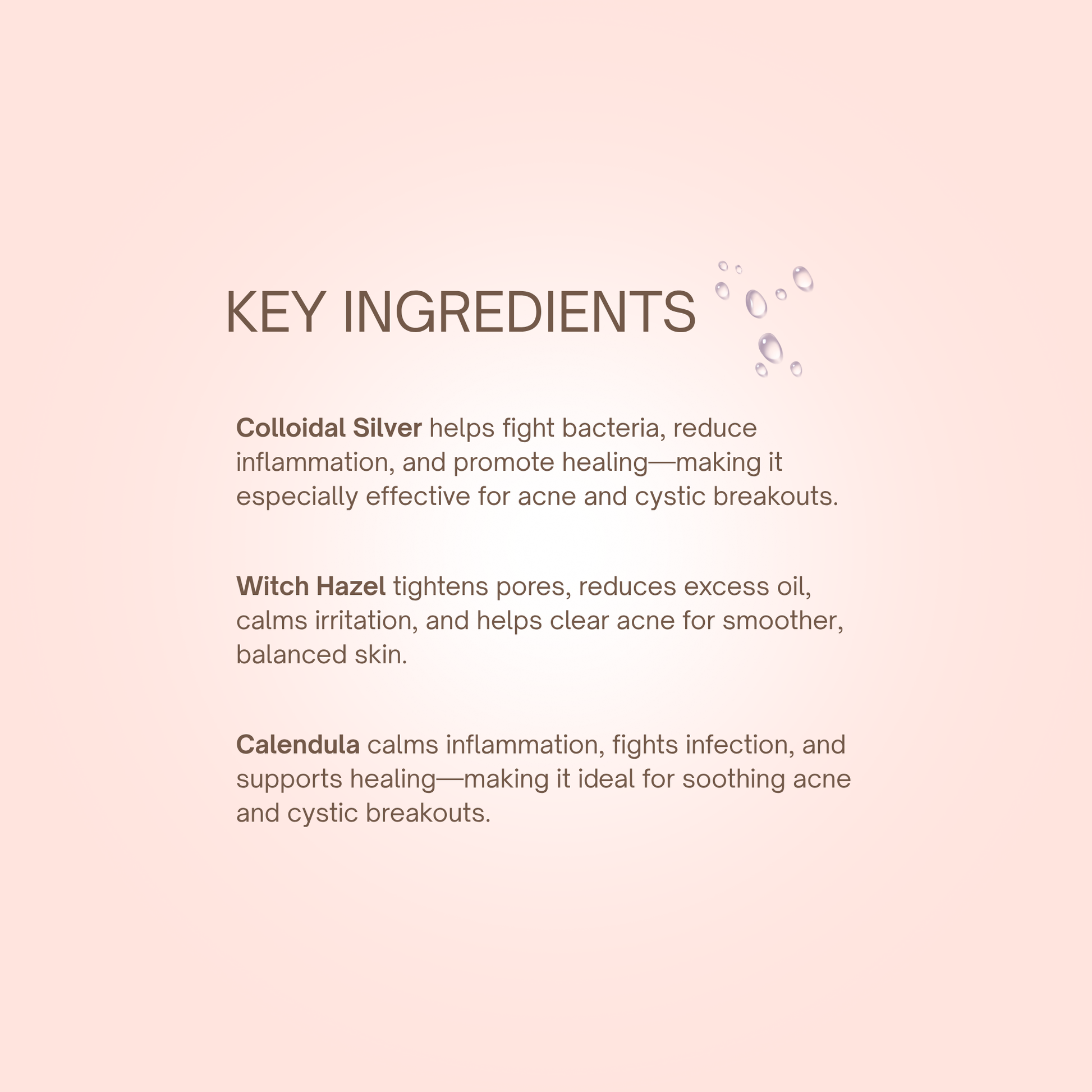 Acne Silver Toner is the result of the collaboration with a Dermatologist and Homeopathic doctors and has been tested on patients with acne, cystic acne, and rosacea for several years now.